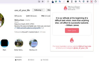 CEO ของ Your Life Quotes เป็นส่วนขยาย Chrome ที่ออกแบบมาเพื่อมอบแรงบันดาลใจและแรงจูงใจในแต่ละวันทุกครั้งที่เปิดแท็บใหม่ เครื่องมือนี้ฟรีให้ผู้ใช้มีคำคมที่สร้างแรงบันดาลใจซึ่งมีเป้าหมายเพื่อเพิ่มอารมณ์ เสริมสมาธิ และลดความเครียด โดยการเริ่มต้นวันด้วยความคิดเชิงบวก ผู้ใช้สามารถตั้งเสียงที่มีประสิทธิผลสำหรับกิจกรรมของตน ส่วนขยายนี้มีประโยชน์โดยเฉพาะสำหรับผู้ที่ต้องการส่งเสริมความยืดหยุ่นและเพิ่มผลผลิตในชีวิตประจำวันของตน